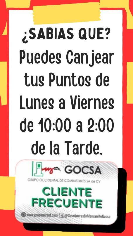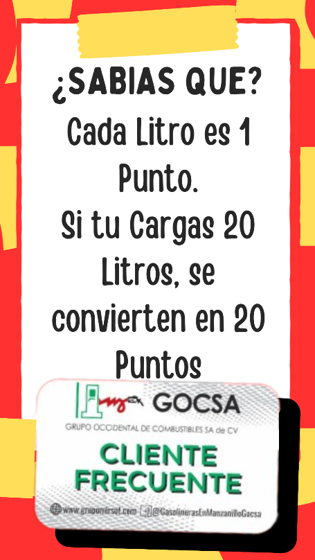 Grupo Occidental de Combustibles S.A. de C.V. ha decidido lanzar una campaña de fidelización de clientes de CONTADO, con una tarjeta de CLIENTE FRECUENTE la cual serviría para acumular puntos por cada litro cargado de gasolina PREMIUM Y MAGNA. Esto se llevará a cabo a partir del día 02 de diciembre de 2019.